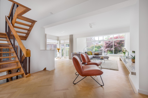 Begane grond: entree, hal, trapkast, toilet, lichte woonkamer (ca. 6.94x3.96 m.), semi-open keuken met inbouwapparatuur;